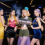 Five women in stylish dresses pose together. "Hot Escort Girls" sign is held in the center.